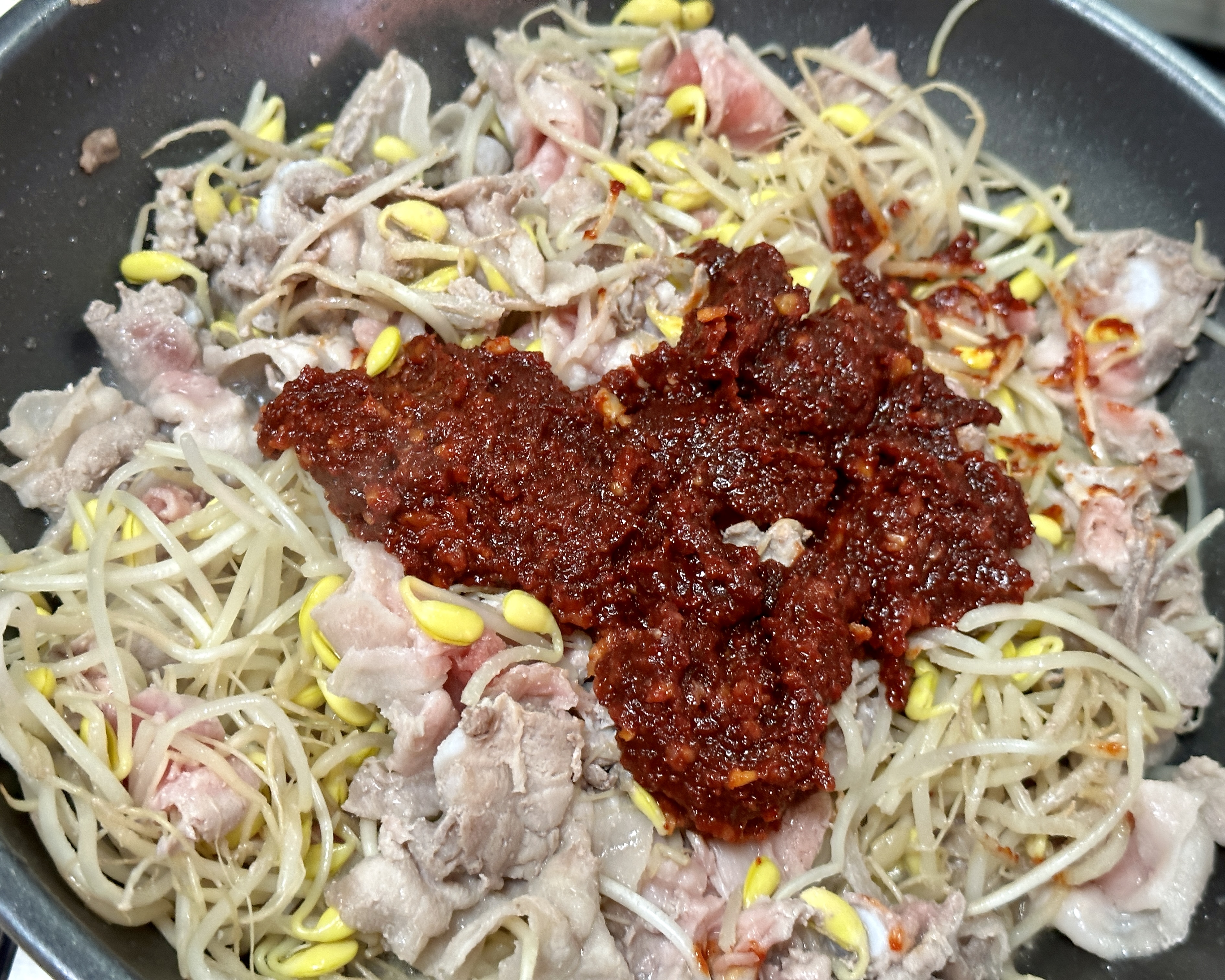 넓은 팬에 콩나물과 대패삼겹살을 넣고